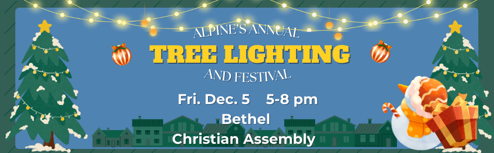 We’re thrilled that you’ll be joining us for Alpine’s Annual Tree Lighting and Festival on Thursday, December 5th, hosted at Bethel Christian Assembly, 1929 Arnold Way.